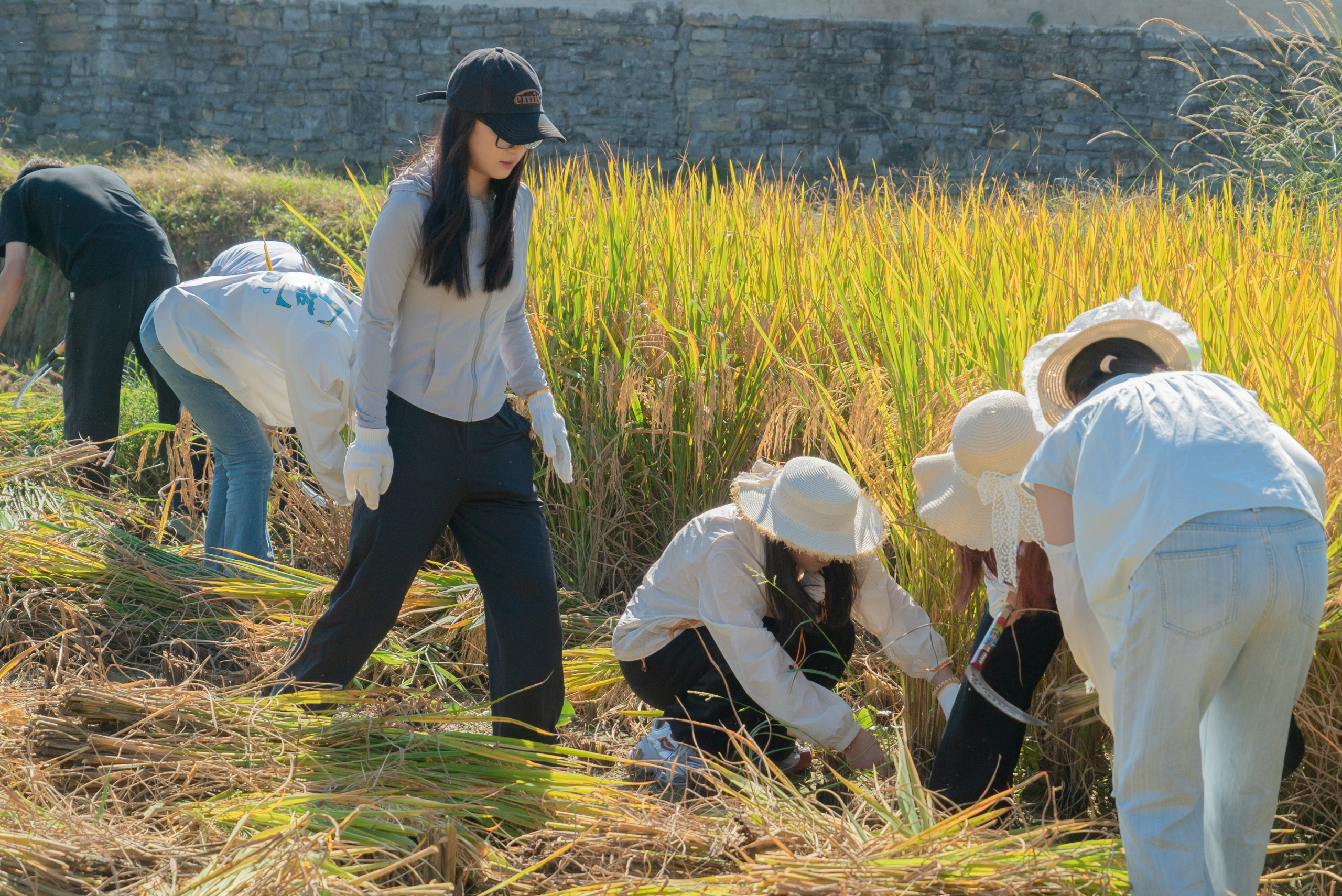 抵达路寨村后,连片稻田里金黄的谷穗随风摇曳,村民们忙碌的身影点燃了学员们的热情。在郭薇书记及村民的指导下,学员们迅速掌握了割谷、打谷、装袋的技巧,纷纷拿起镰刀、扛起粮袋,穿梭于田间地头。张福高书记与位老师带头参与劳作,一边收割谷子,一边与郭薇书记深入交流,了解村情民意,探讨粮食产销和乡村治理等实际问题特别是三农法律相关实务问题师生党员分工协作,汗水浸透了衣衫,但干劲不减,大家以实际行动践行着“为人民服务”的初心使命。