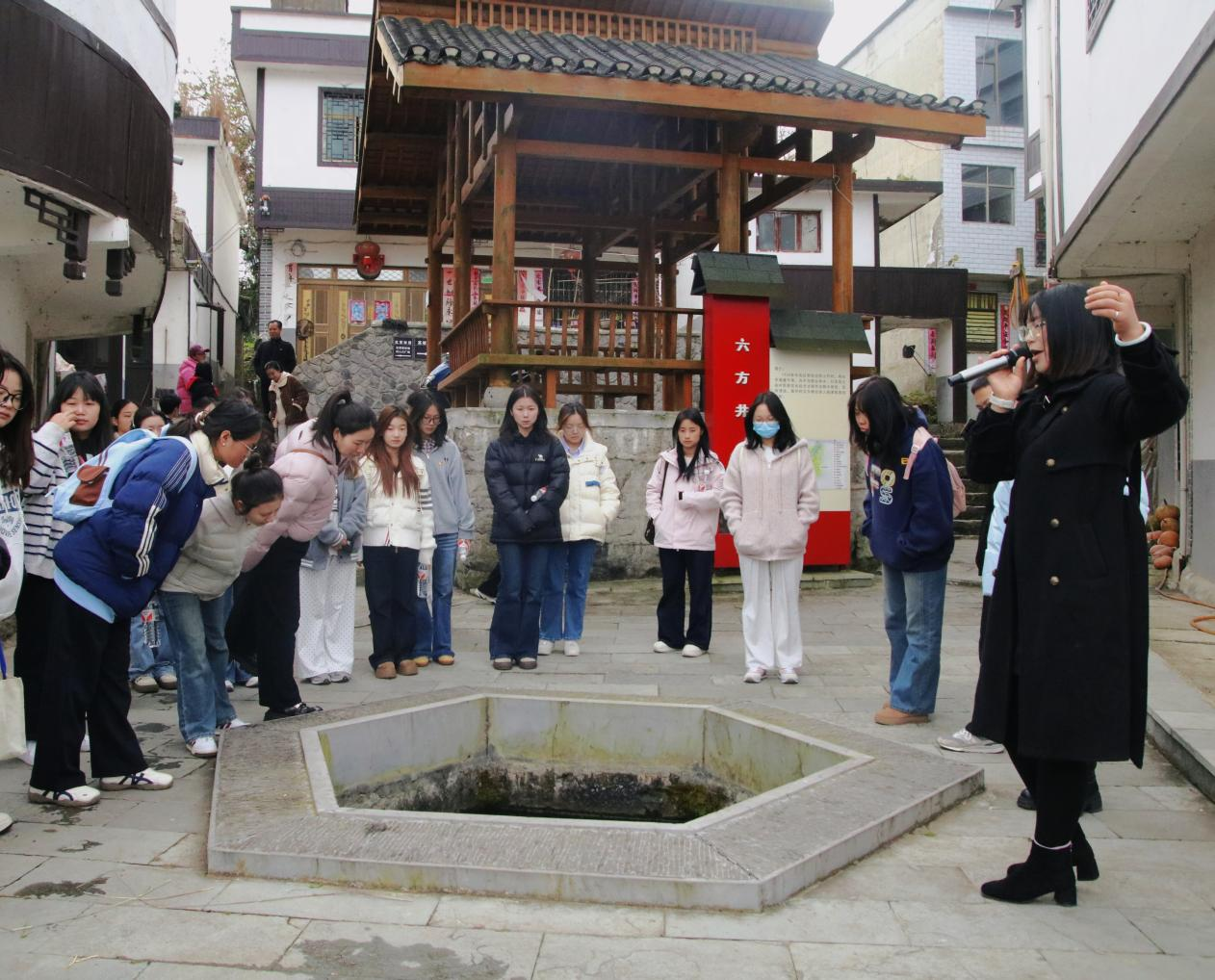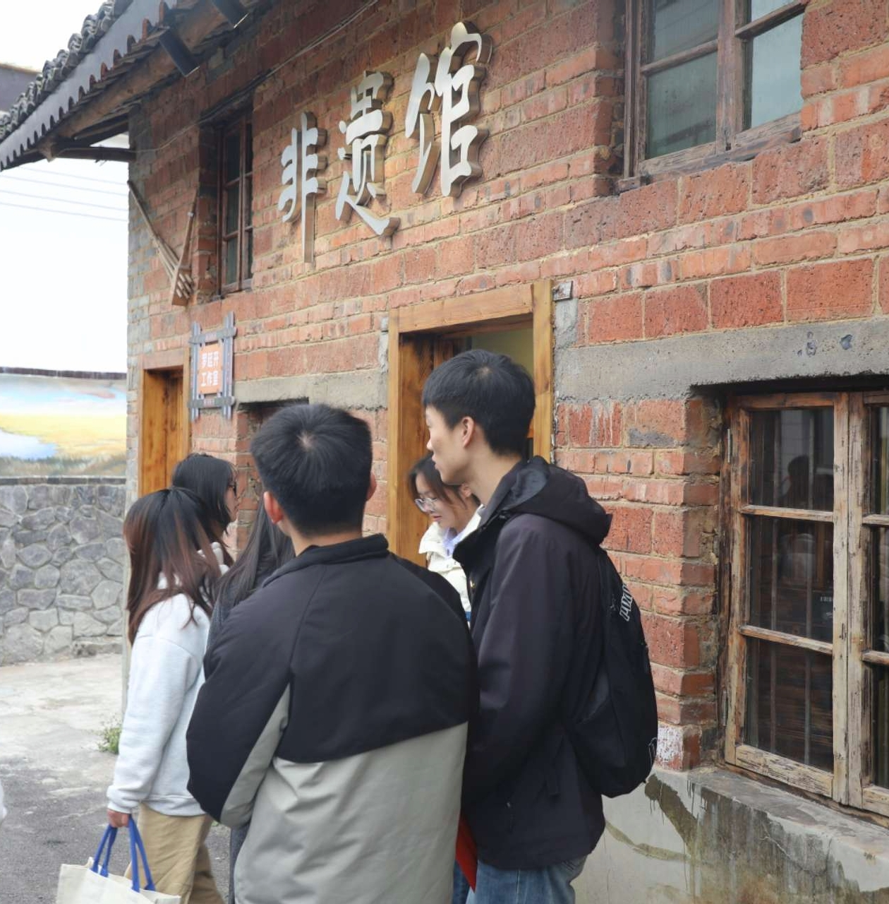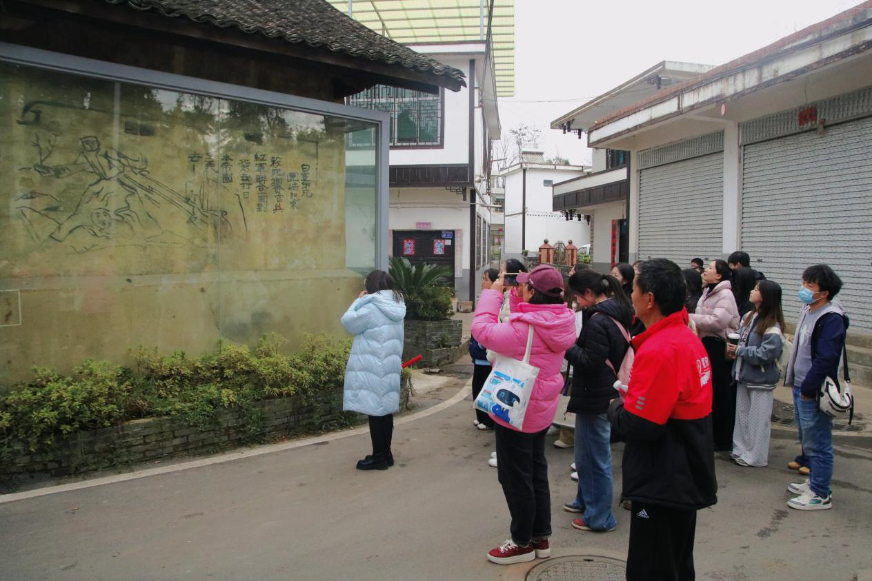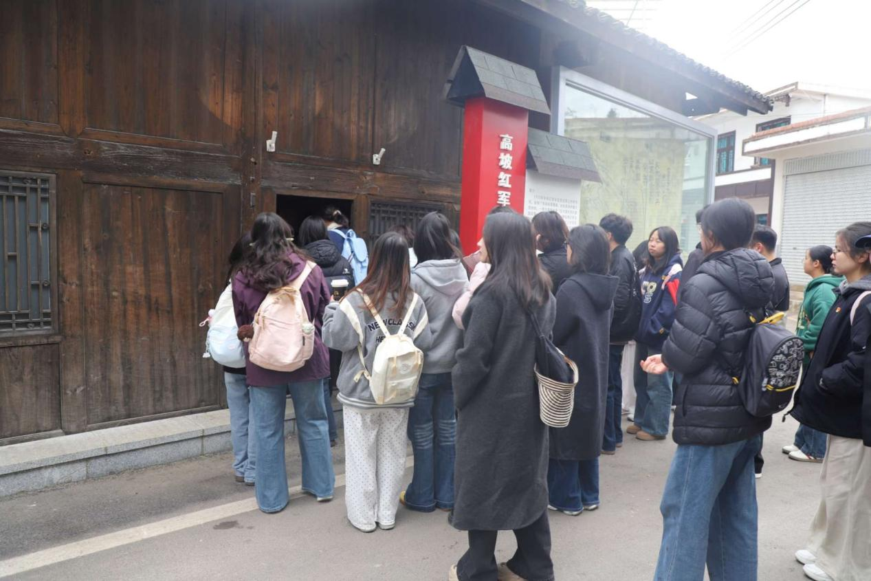 上午8时30分,参与人员身着便于徒步的着装,党员们佩戴党徽,在农学实验室门口整齐集合,统一乘车前往红色教育基地。抵达目的地后,研学活动正式拉开帷幕。在讲解员的引导下,师生们首先走进村史馆与非遗馆,在村史脉络与非遗技艺的展示中,了解当地的历史底蕴与文化根脉;随后步入红军标语馆,斑驳墙面上的红军标语——“反对国民党的卖国政策”,以直白有力的文字体现了革命年代的信仰呐喊。