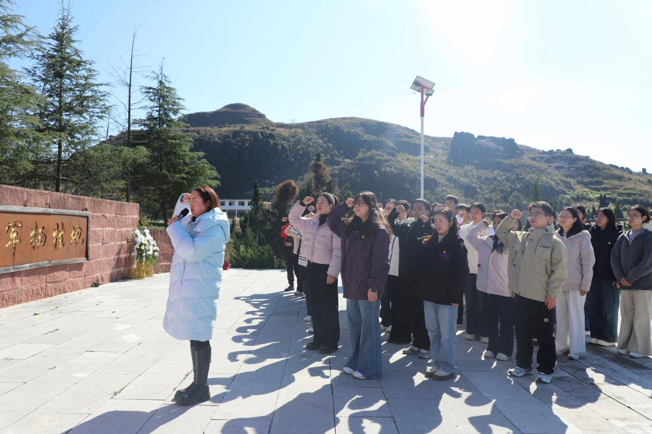 紧接着,前往高坡乡红军居住地广场,在“三双鞋子映初心”的故事中,体会红军与群众的鱼水深情;在拥军坟前,师生们驻足肃立,聆听拥军支前的感人往事,深切缅怀革命先烈。随后,全体人员踏上花溪红军长征历史步道,途经红军桥,在徒步中追寻革命先辈的足迹,切身感受长征路上的艰辛不易。行至步道终点,最后来到红军牺牲地,大家在庄严肃穆的氛围中举行缅怀仪式,面对鲜红的党旗高举右拳,齐声重温入党誓词,铿锵誓言里满是对初心使命的庄严承诺,更彰显着新时代师生党员传承红色精神、勇担时代使命的坚定决心 。