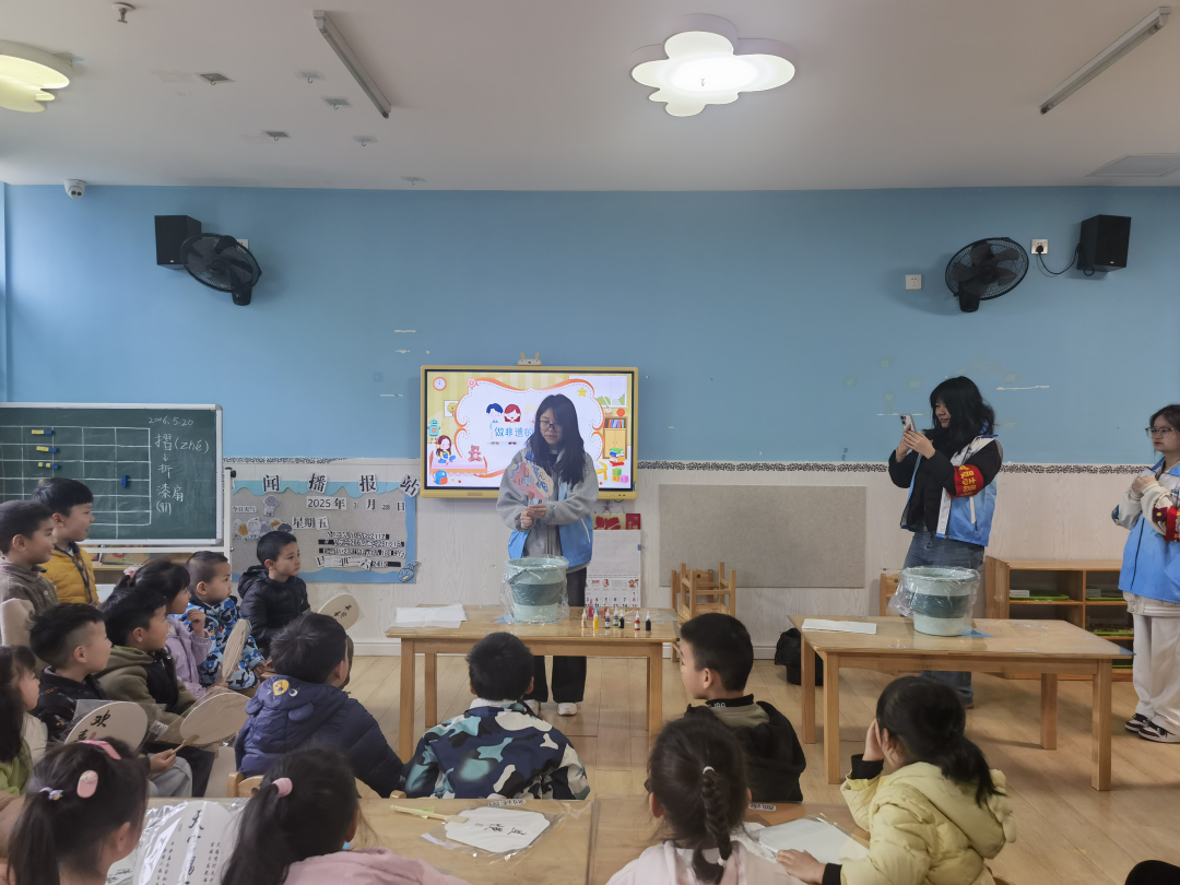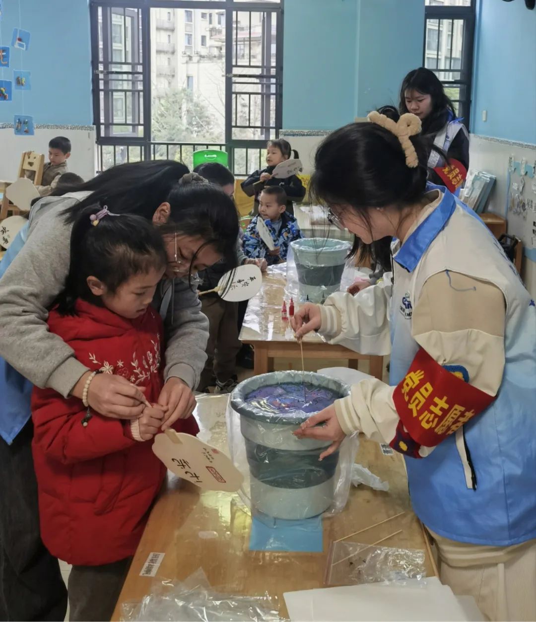 在绘制环节,党员们创新采用“分步示范+个性创作”模式:先以“水墨晕染”技法演示漆料调和过程,再引导幼儿用“点染”“滴撒”等手法在扇面挥洒创意。面对小朋友们“为什么漆料会流动”“如何让颜色更鲜艳”等提问,党员们结合化学知识,用“分子扩散”“颜料密度”等科学原理深入浅出解答,实现传统文化与学科知识的有机融合。