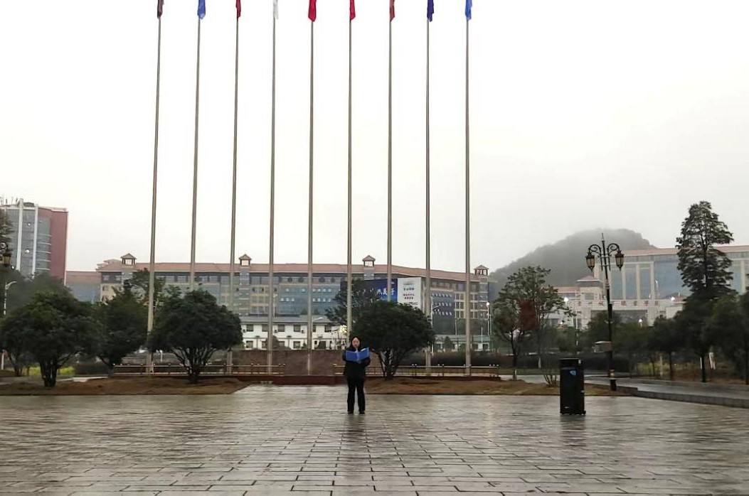 升旗仪式现场,2022级休闲体育专业学生孔海艳丽、2024级环境设计专业学生陈亚楠分别做国旗下的讲话。