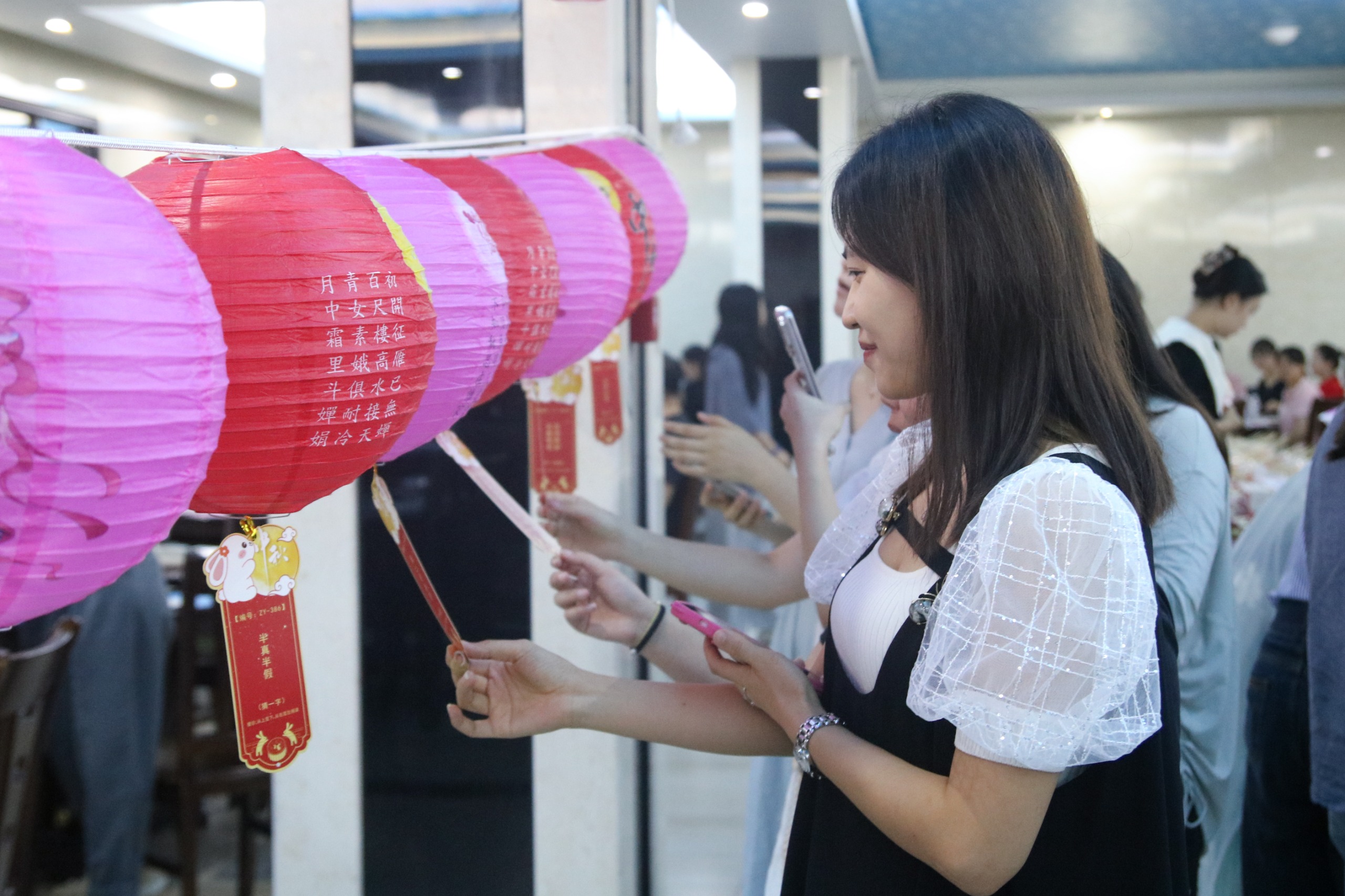 五彩斑斓的灯谜纸条悬挂在餐厅各处,老师们认真挑选着自己心仪的灯谜。有的老师低头沉思,有的老师与同事小声讨论,大家都沉浸在猜谜的乐趣中。取下谜面后,老师们纷纷前往指定位置进行竞猜,喜悦溢于言表。