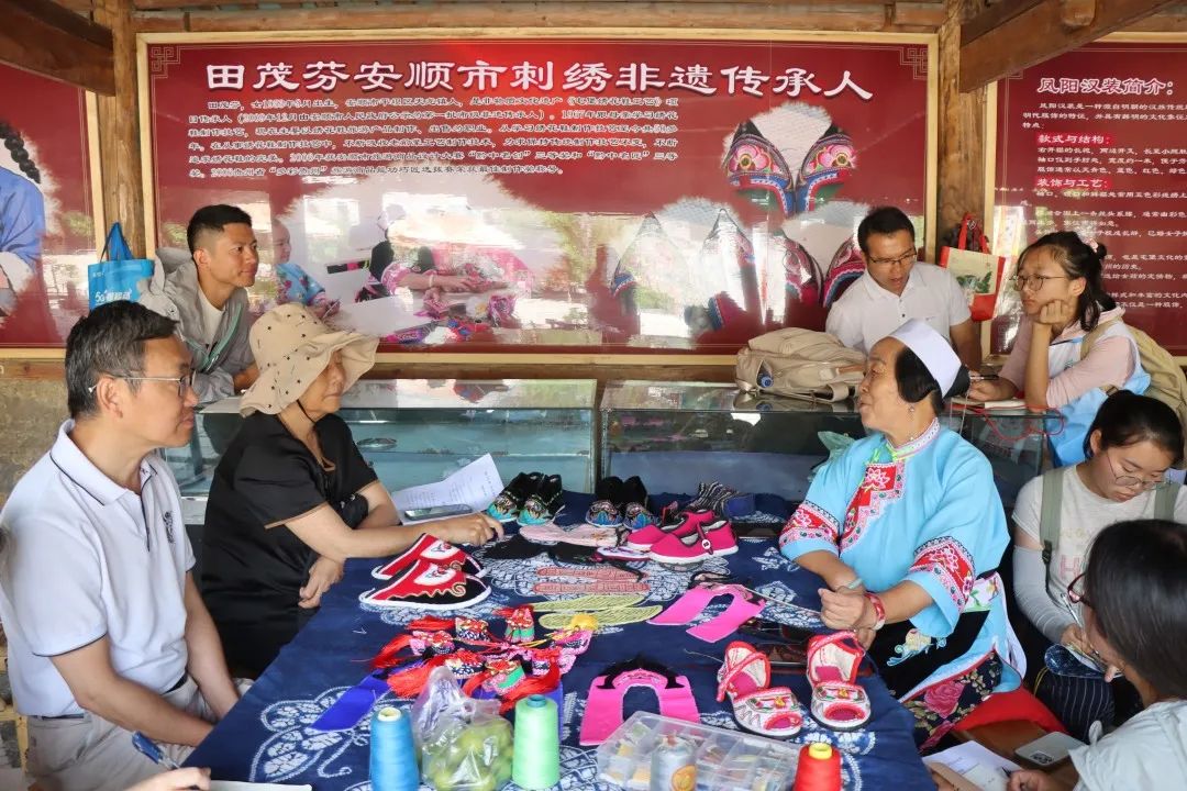 调研团队首站抵达天龙屯,实地调研了天龙中学、天龙小学及屯堡建筑群等,并与当地的省级非遗代表性传承人田茂芬女士进行深度交流。田茂芬女士详细介绍了自己的身世和屯堡刺绣技艺,她还现场为大家展示了精湛的刺绣技法,生动体现了屯堡女性“以针代笔”的艺术创造力。调研团队成员通过近距离观察精美的屯堡绣品,深刻地感受到这一非遗技艺承载的文化记忆及其艺术价值。