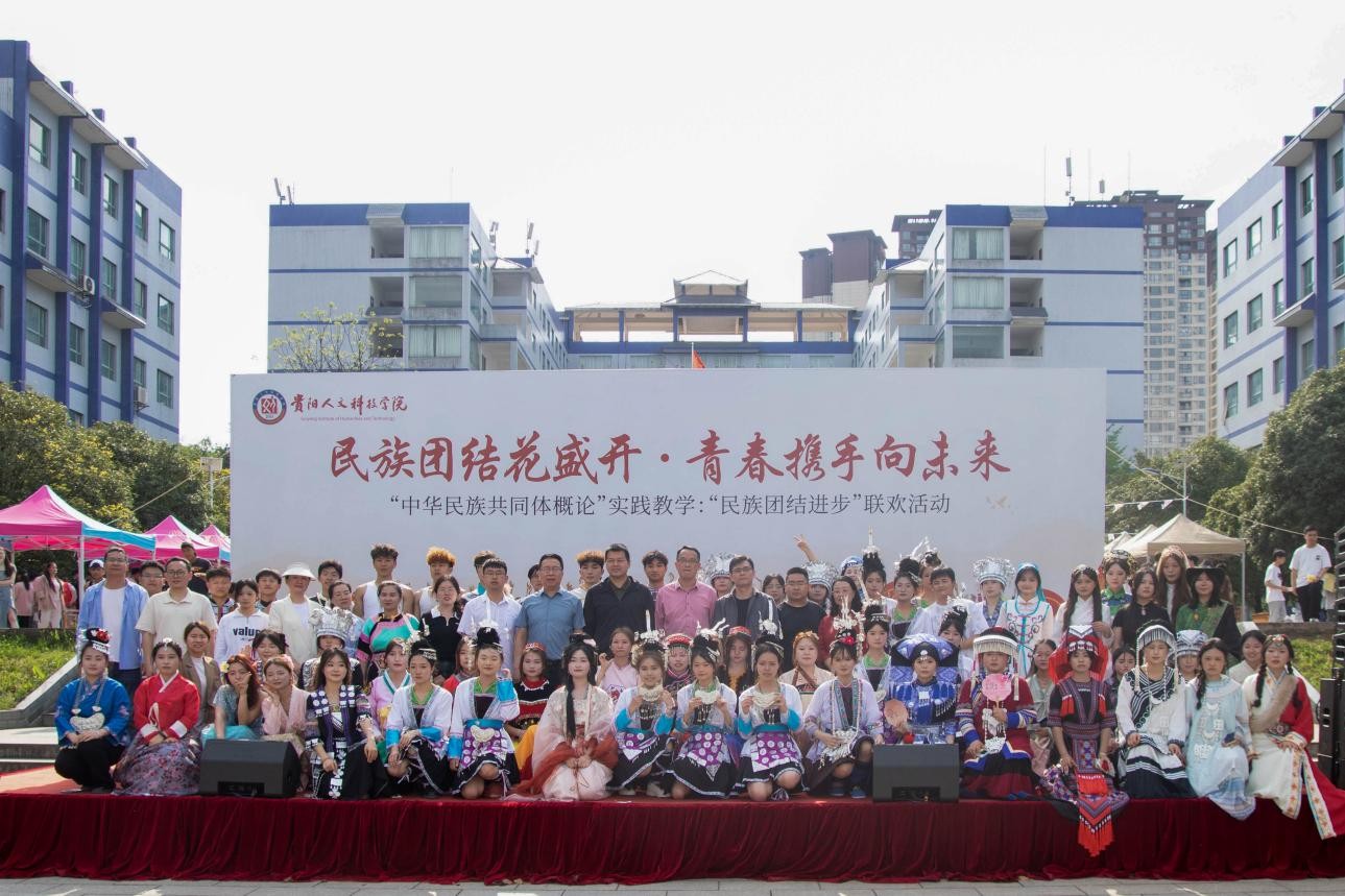 接下来的节目表演环节将活动推向了高潮。唤醒红色记忆,深情演绎邓恩铭烈士与中华民族复兴的故事,再现革命先辈的民族团结精神。舞动民俗风情,舞蹈《大山》、土家族摆手舞、舞蹈串烧《华章盛世》、民族服装走秀等节目轮番登场,彰显中华艺术的百花齐放。唱响民族团结之歌,以少数民族语言为载体的《侗歌声声唱给党》、用民族乐器吹响的乐曲《年轮木叶声声》等特色节目生动呈现了各民族交往交流交融的温馨场景,传递出人文青年学子共筑中国梦的坚定信念。活动中穿插的主持人与观众、演员与观众激情互动的抛接五彩绣球以及师生牵手合跳侗族“踩歌堂”多耶舞,进一步将民族团结精神演绎得淋漓尽致。