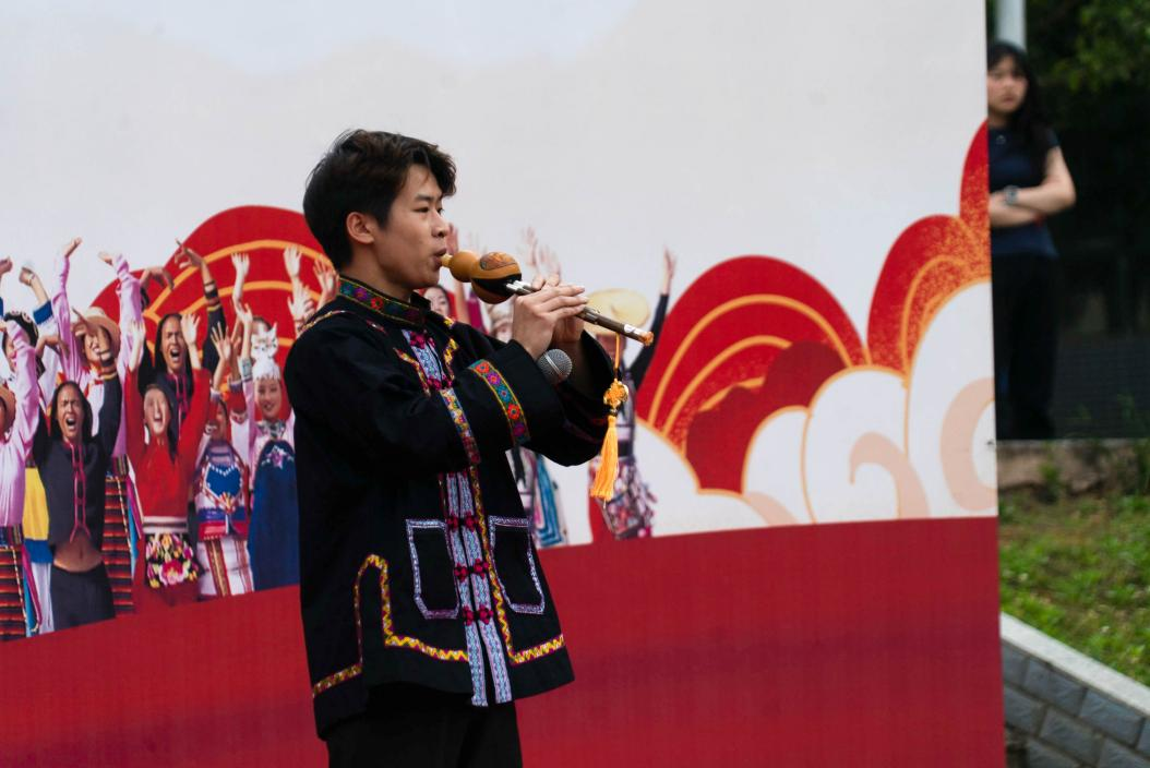 活动伊始,身着月华纹银饰的苗家少年跳着竹竿舞,端着拦门酒热情邀约,吸引了众多师生参与。活动规划了民族小吃区、民族服饰区、民族手工展区等七大特色区域,同学们尽情展示自己民族特色产品背后的文化故事。