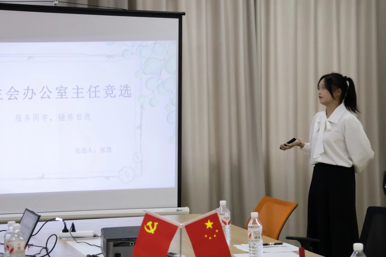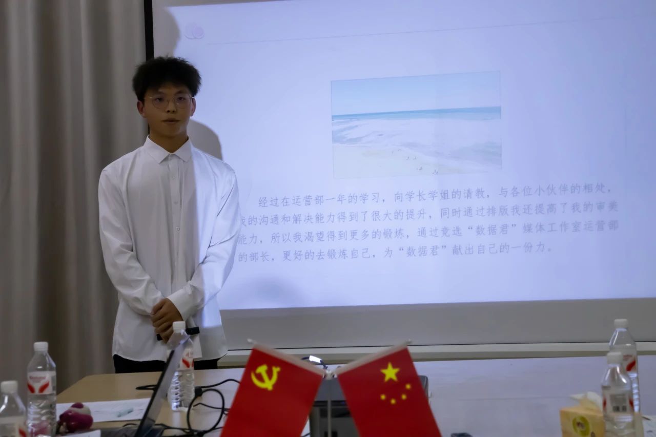 竞选环节按照团委、学生会、“数据君”媒体工作室、志愿服务中心的既定顺序依次开展。每位参与竞选的同学有五分钟的时间展示精心制作的PPT,从自我介绍、过往工作成绩、到未来工作规划等方面进行全面阐述。展示结束后,现场的评委结合汇报内容,对同学们进行随机提问,全方位考察竞选者的能力与素养。