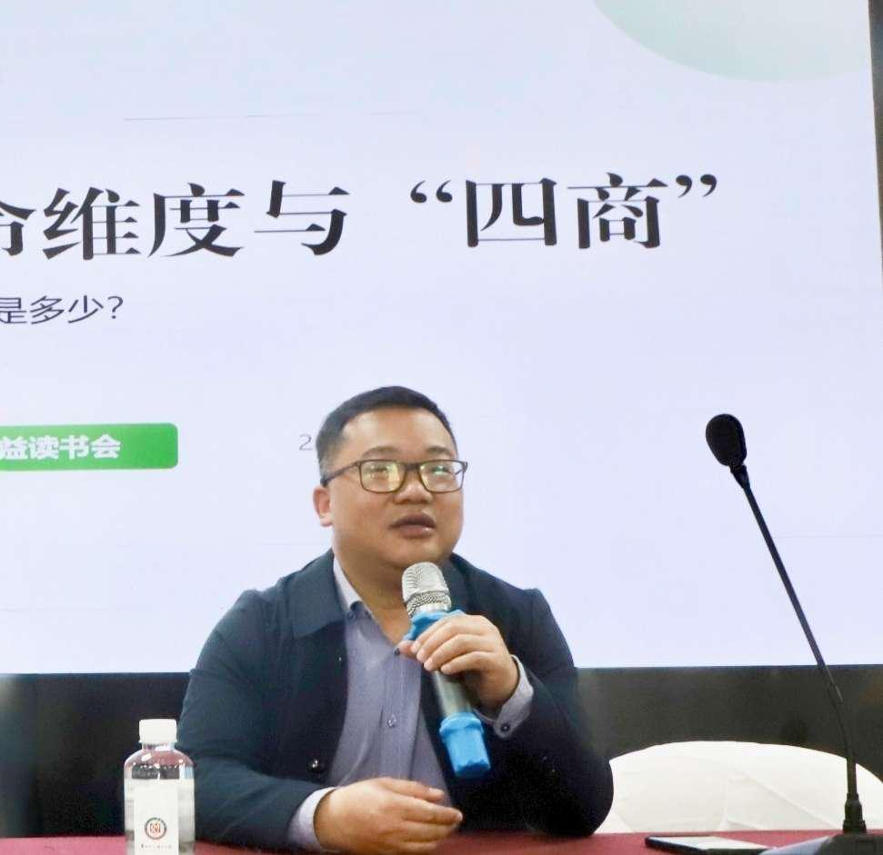 4月11日,伟德国际1949官网法学院、贵州育佳公益基金会、愿果公益读书会、知识产权仲裁研究院在伟德国际1949官网大学城校区师德楼307会议室联合举办“生命维度与人的四商”讲座。知识产权仲裁研究院主任卜贵荣、法学院院长杨武松、党委副书记杨晶晶、副院长倪亭、学院教师刘凌云、郭畅和愿果公益读书会志愿者以及法学院部分同学参加本次讲座。