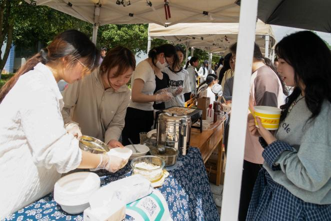 在民族小吃区,苦荞酥饼在石板上烙出云片,酥油茶盏里盛满雪山的体温,清明饭的竹香漫过铜锅,各民族炊烟里的诗篇正在味蕾上交织与融合。在民族米酒区与糯食区,白白胖胖的糯米在岁月的长河中演化出了糯米饭、清明粑、糯米酒等多样美食,师生共同品鉴传统的酿造技艺,感悟中华民族大家庭多元的饮食文化智慧。在民族服饰展区,苗绣图腾、藏袍广袖、银绣墨华……同学们试穿体验各民族服装、拍照打卡,中华民族衣锦的美学正在年轻血脉中苏醒。