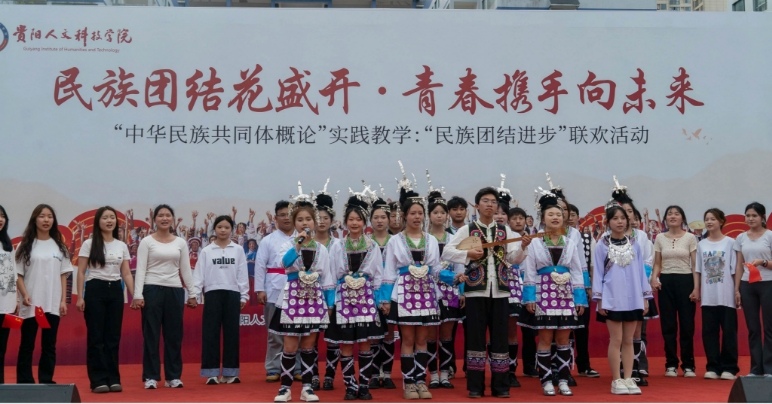 接下来的节目表演环节将活动推向了高潮。唤醒红色记忆,深情演绎邓恩铭烈士与中华民族复兴的故事,再现革命先辈的民族团结精神。舞动民俗风情,舞蹈《大山》、土家族摆手舞、舞蹈串烧《华章盛世》、民族服装走秀等节目轮番登场,彰显中华艺术的百花齐放。唱响民族团结之歌,以少数民族语言为载体的《侗歌声声唱给党》、用民族乐器吹响的乐曲《年轮木叶声声》等特色节目生动呈现了各民族交往交流交融的温馨场景,传递出人文青年学子共筑中国梦的坚定信念。活动中穿插的主持人与观众、演员与观众激情互动的抛接五彩绣球以及师生牵手合跳侗族“踩歌堂”多耶舞,进一步将民族团结精神演绎得淋漓尽致。