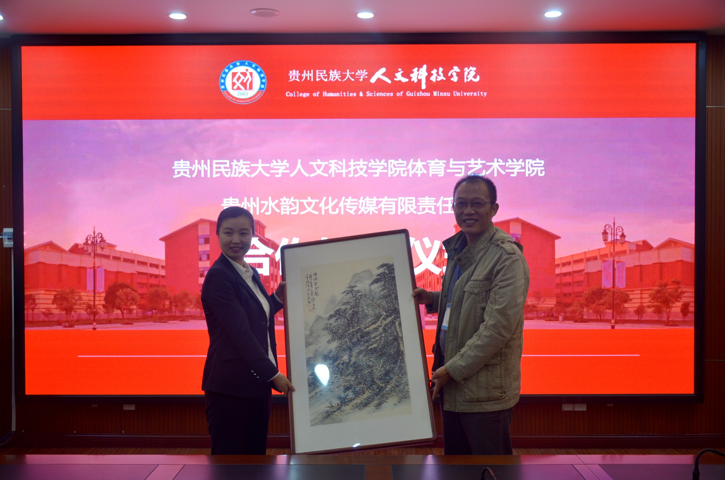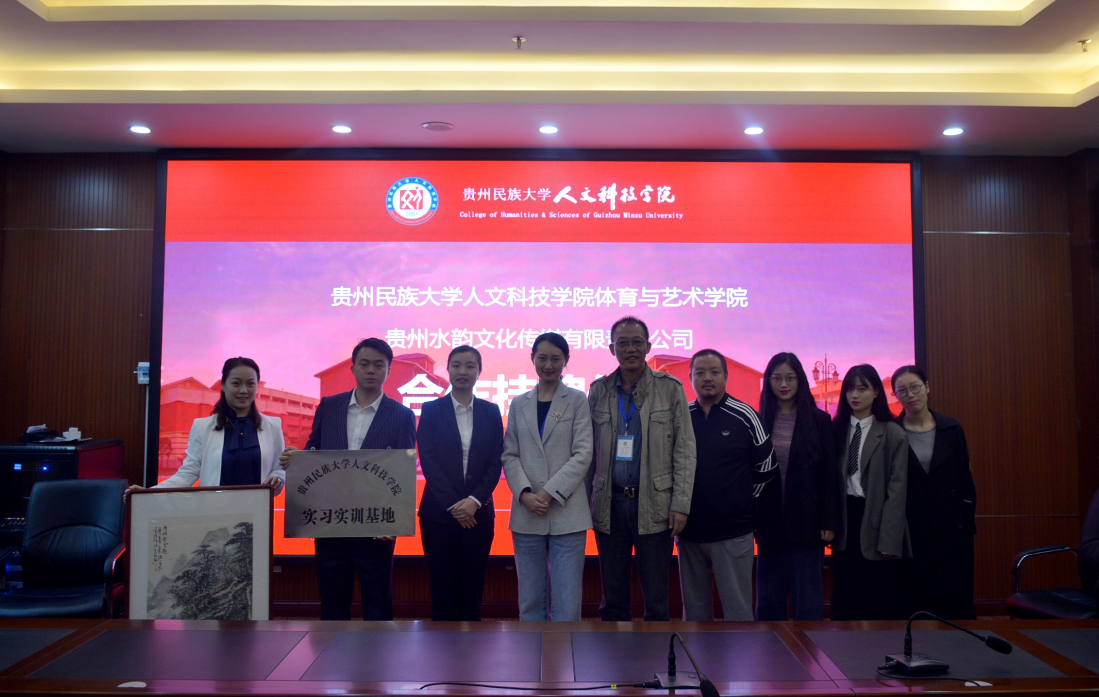 签约仪式上,伟德体育与艺术学院院长雷帮齐和贵州水韵文化媒体有限责任公司执行董事罗丽玲签订了专业校企合作协议,并赠与贵州水韵文化媒体有限责任公司一幅山水画,表达对双方合作的美好祝愿。随后,伟德副校长左丹代表学校为贵州水韵文化媒体有限责任公司进行了授牌仪式,并进行合影留念。