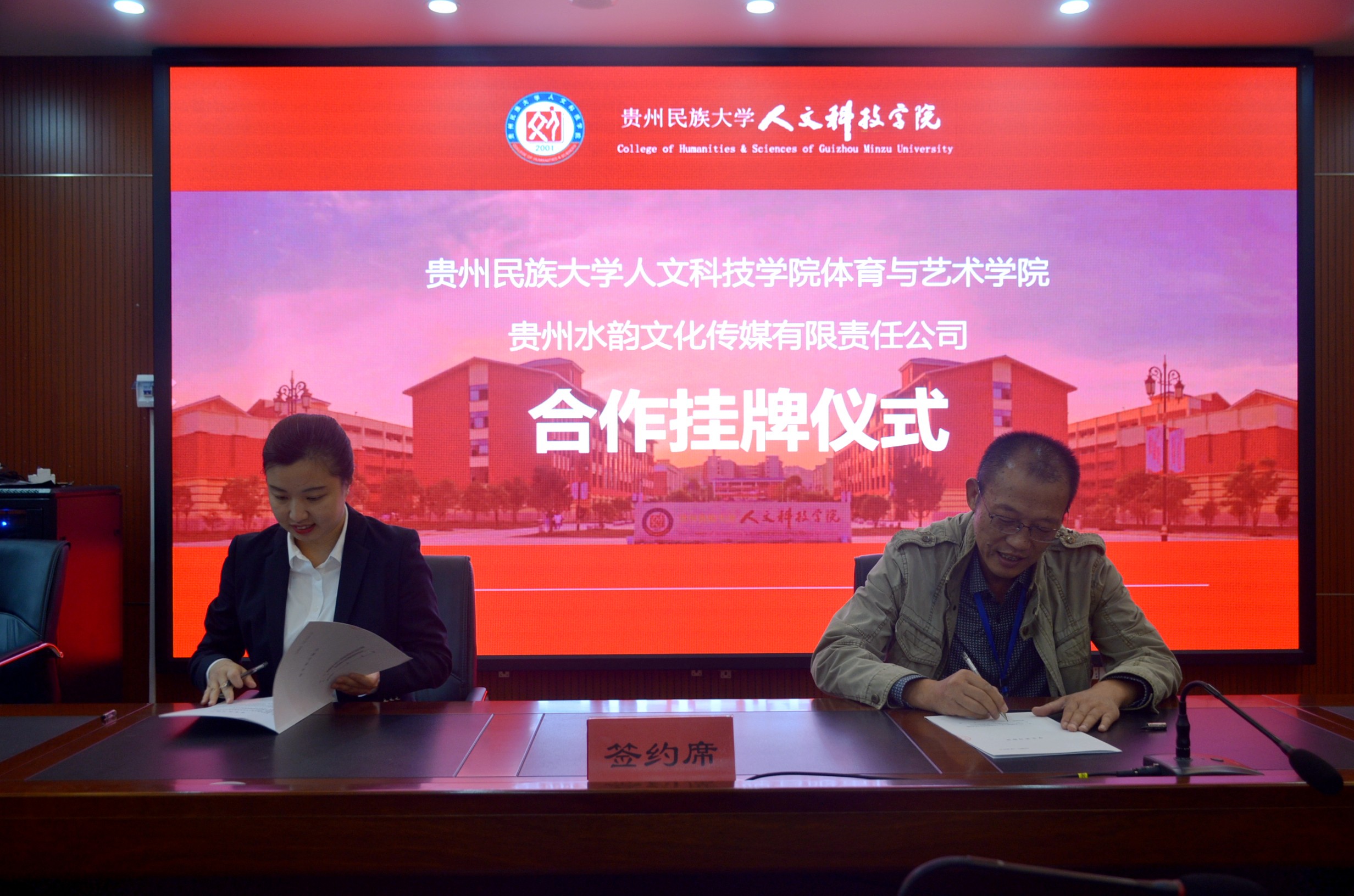 雷帮齐院长和贵州水韵文化媒体有限责任公司执行董事罗丽玲签订专业校企合作协议
