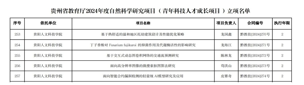 日前,贵州省教育厅公布了2024年度自然科学研究项目(青年科技人才成长项目)立项名单,伟德建筑工程学院龙国鑫老师申报的《基于热舒适的温和地区托幼建筑设计及性能优化策略》、文化旅游与区域发展学院龙海江老师申报的《丁子香酚对 Fusarium fujikuroi 的抑菌作用及代谢酶活性的影响研究》、大数据与信息工程学陈林龙老师申报的《基于交互式动态图卷积网络的交通流预测研究》、苟洪山老师申报的《面向高分辨率图像的微搜索抠图算法研究》、皮赛奇老师申报的《面向智能合约漏洞检测的轻量级AI模型研究及应用》项目获得青年科技人才成长项目立项。
