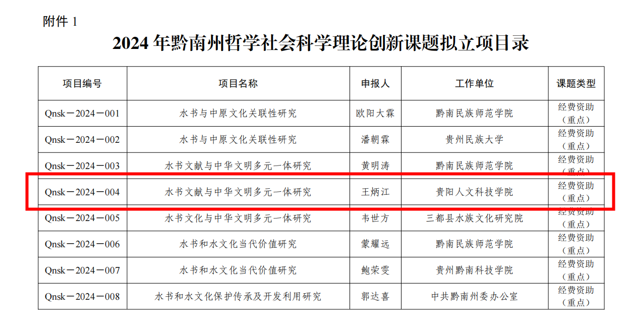 近日,中共黔南州委宣传部、黔南州社会科学界联合会公布了《关于2024年度黔南州哲学社会科学理论创新课题立项的通知》,伟德文化旅游与区域发展学院王炳江老师申报的课题《水书文献与中华文明多元一体研究》获得重点项目立项。