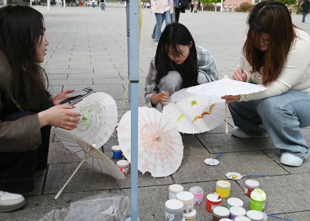 在油纸伞体验区,师生们通过投壶游戏和书法接龙赢取制作机会,用画笔在伞面上勾勒山水花鸟,创作出独一无二的非遗作品。油纸伞在阳光下绽放,成为校园里一道流动的风景。