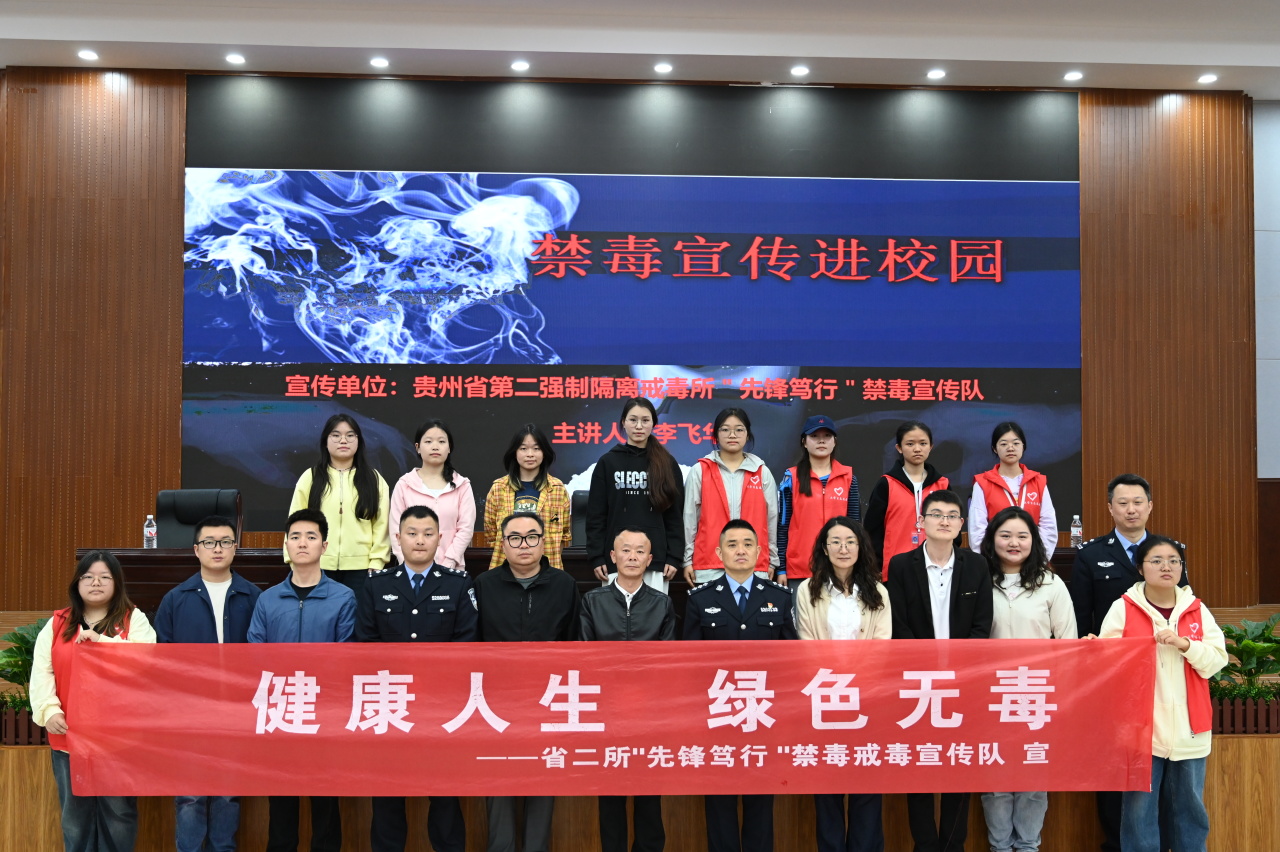 贵州省第二强制隔离戒毒所三大队副大队长李飞华警官在宣传活动中通过真实案例剖析、仿真毒品展示、互动答疑等不同形式将毒品带来的危害一一呈现给同学们,视频中触目惊心的吸毒者生活,让大家深刻意识到毒品对个人身体与精神的双重摧残。