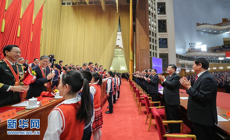 全体起立,热烈鼓掌,向受表彰人员表示衷心祝贺和崇高敬意。少先队员向他们献上美丽的鲜花。