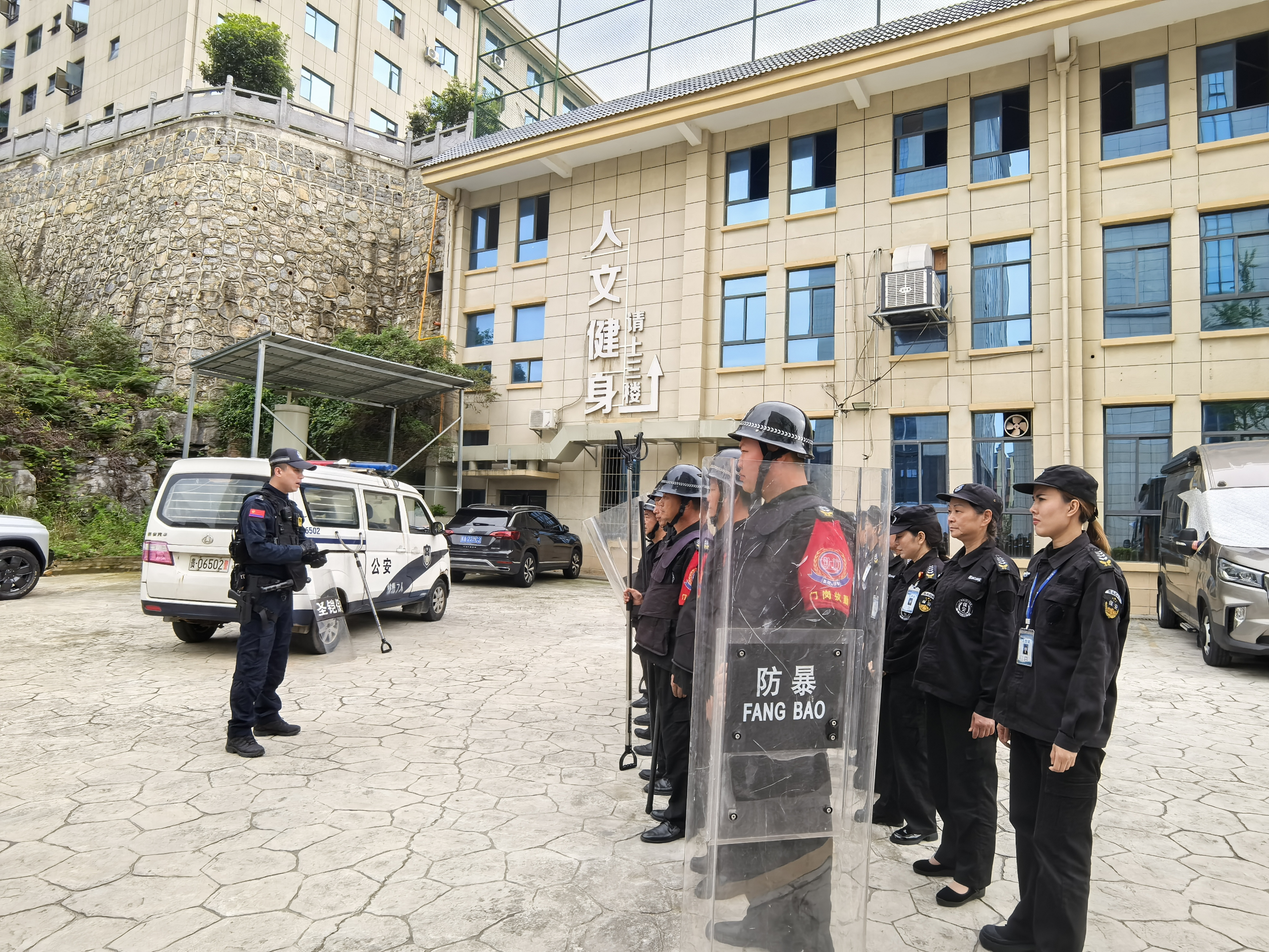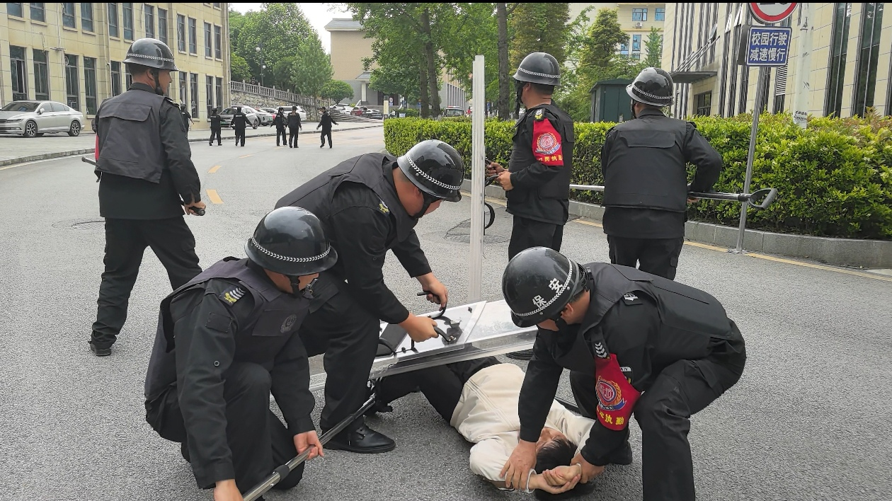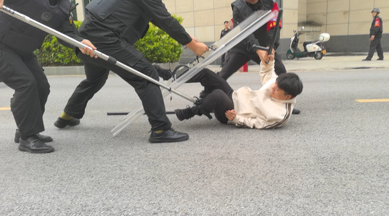 随着警报声响起,演练正式开始。一名“暴徒”手持凶器强行闯入校园,校园保安迅速反应,第一时间按下“一键报警”装置,并手持防暴器械与“暴徒”展开周旋,试图阻止其进一步行凶。接到报警后,公安部门迅速赶到现场,与保安人员紧密配合,运用战术动作将“暴徒”成功制服。整个演练过程紧张有序,各环节衔接紧密,参演人员反应迅速、配合默契,达到了预期效果。