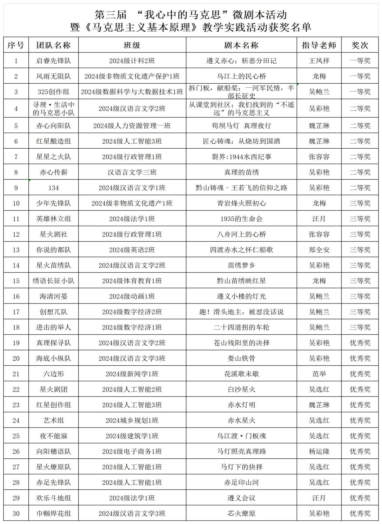此次活动既是一次别开生面的教学实践,更是一场深刻的红色教育与理论熏陶。活动让马克思主义理论走出课本、走进校园生活,使红色基因在青年学子心中深深扎根、代代相传。同学们在组队选题、史料挖掘、剧本创作的全过程中,不仅重温了贵州大地上波澜壮阔的红色历史,真切感受了红色文化的深厚底蕴,更在沉浸式体验中深刻领悟了马克思主义的真理力量与实践伟力。