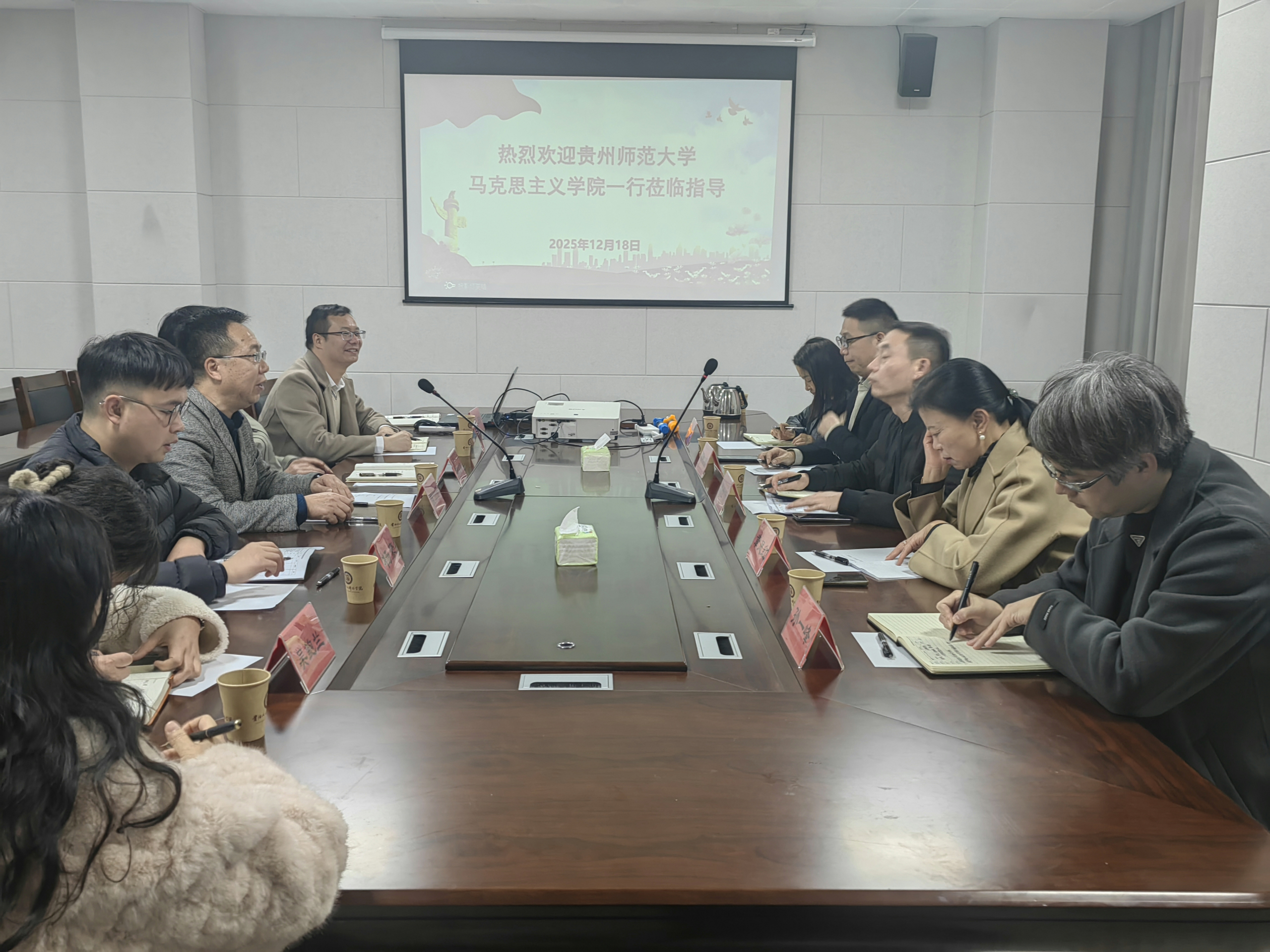 贵州师范大学路世传书记高度肯定我院在学科建设、课题研究和人才培养等方面取得的突出成绩。结合贵州师范大学马克思主义学院的建设经验与资源优势,他提出了多项富有建设性的合作设想。双方达成共识,一是围绕党建课题联合攻关,整合两院科研力量打造高质量研究成果;二是共同承办全省大中小思政课一体化集体备课会,推动思政教育贯通衔接;三是将党的二十届四中全会精神有机融入思政课教学设计,提升课堂教学的时代性与针对性;四是建立专家互访机制,贵州师范大学马克思主义学院将选派资深专家莅临我院,在教学改革、科研申报、团队建设等方面提供精准指导。