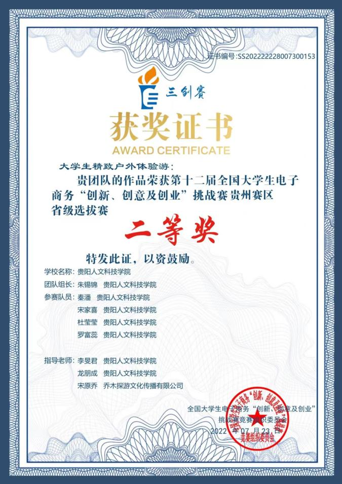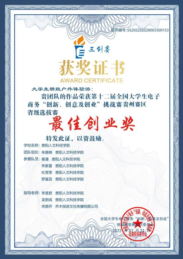 2022年8月,朱锡锦的团队又凭借《大学生户外联盟》项目在第十三届“挑战杯”贵州省大学生创业计划竞赛中获三等奖;2020级休闲体育专业学子杨龙的团队凭借《零计划》项目斩获一等奖。