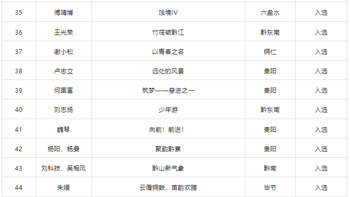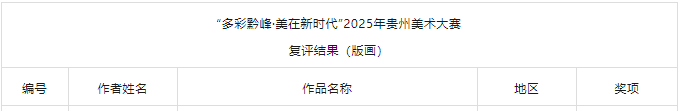 近日,由中共贵州省委宣传部、贵州省文化和旅游厅、贵州省文学艺术届联合会共同主办的“多彩黔峰·美在新时代”2025年贵州美术大赛发布复评结果公示,我校2013级动画专业朱敏的《苗岭风情》斩获版画三等奖,2024级美术学专业学生王光荣的《竹筏破黔江》、魏琴的《向前!前进!》两份作品入选。2015级美术学专业谭政义的《施秉云台山》、2016级美术学专业莫泽亮与朱虹颖等合作的《苍峦云起・黔乡新途》均顺利入选中国画板块。