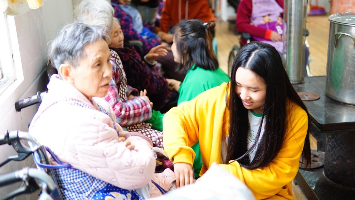 志愿者把敬老院的小院清理干净,陪老人拉拉家常、讲讲笑话。志愿者们组织五彩缤纷的表演节目,歌声回荡在小院里,伴着老人们的欢笑声。