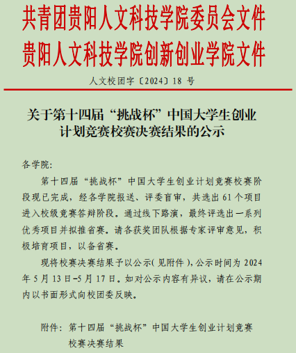关于第十四届“挑战杯”中国大学生创业 计划竞赛校赛决赛结果的公示