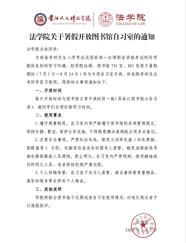 为给备考研究生入学考试及国家统一法律职业资格考试的同学提供良好的学习环境,经学院协调,图书馆701室、801室将于暑假期间(7月5日—8月24日)作为专用自习室开放,供我院考研及法考同学复习使用。现将相关事项通知如下:
