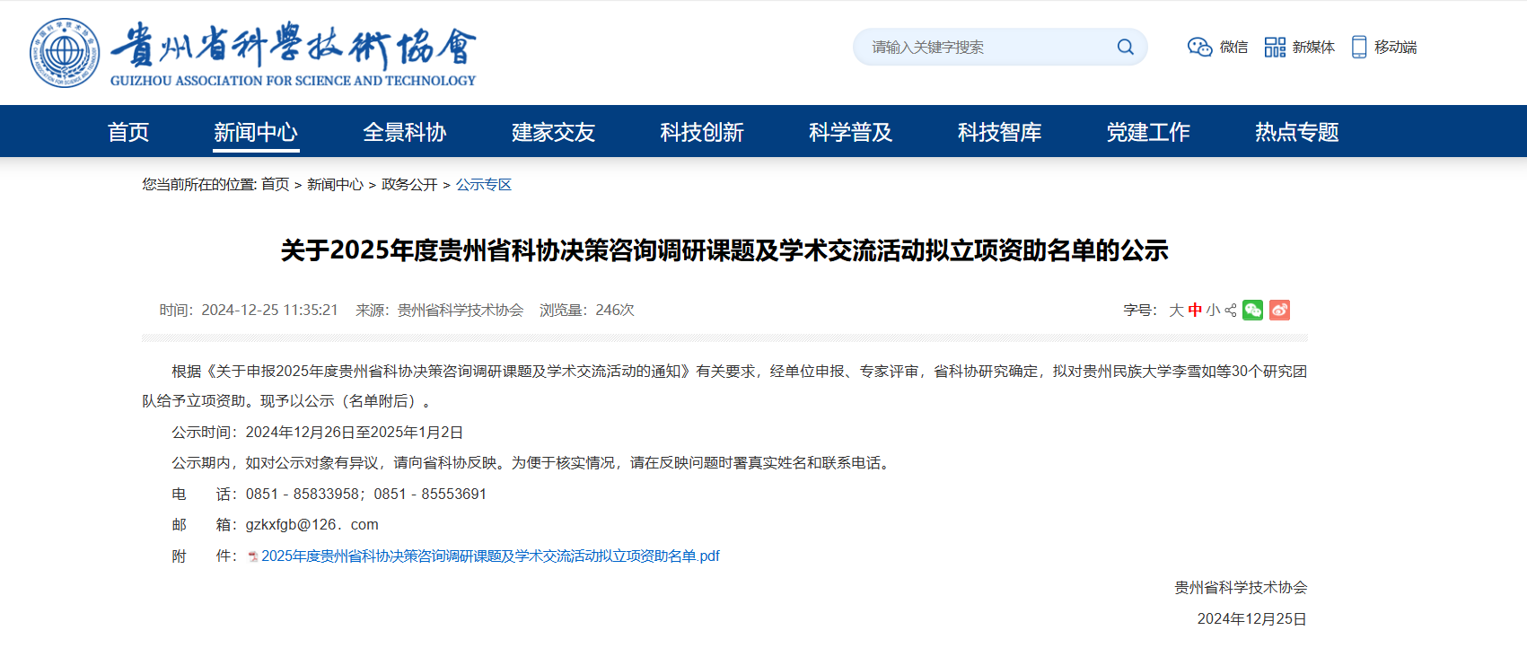 近日,贵州贵州省科学技术协会公布了《关于2025年度贵州省科协决策咨询调研课题及学术交流活动拟立项资助名单的公示》,伟德杨晓老师申报的青年课题《智慧康养:贵州省康养产业科技赋能路径与策略研究》、杨尚钊老师申报的青年课题《返乡创(就)业青年对乡村社会公共服务设施需求研究》喜获立项。