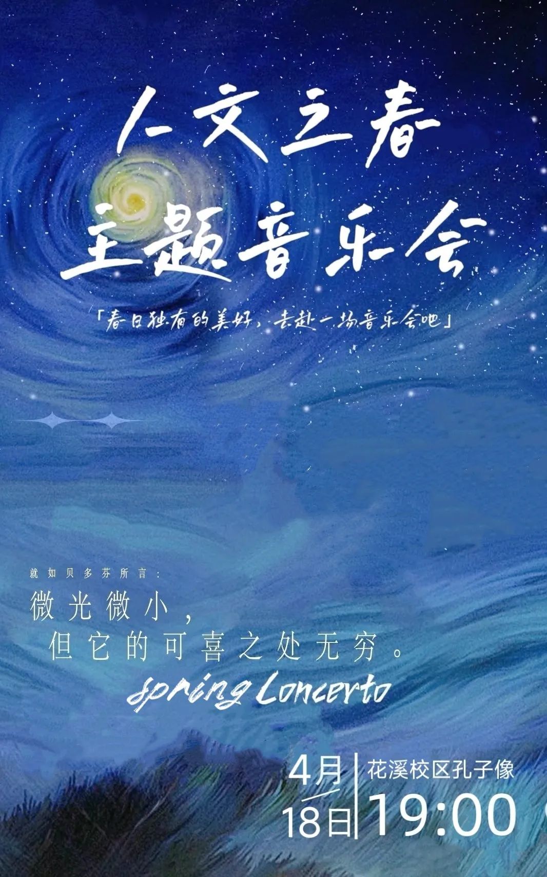 2025年4月18日晚上19:00,伟德国际1949官网花溪校区孔子像前,让我们在音乐里重逢,一起用歌声书写青春的篇章,不见不散!
