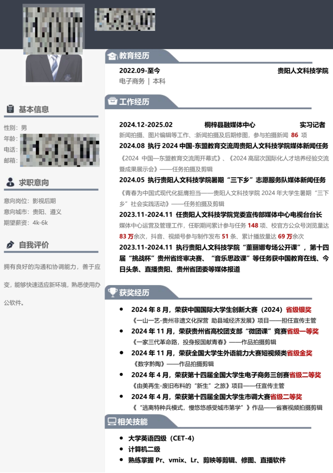 我认为简历的核心是“精准匹配”与“高效传达”。简历不是个人经历的堆砌,而是根据目标岗位需求,筛选出最相关的技能、项目和成果。比如投递剪辑岗,我会突出作品集和产出成果能力。同时用数据量化成就(如“累计参与任务148项、抖音、视频号参与制作发布51条、累计播放量达69万余次等”),比模糊描述更有说服力。关键是设计要服务于功能——清晰的排版、有层次的字体、适度的留白,让HR在5秒内抓住重点。