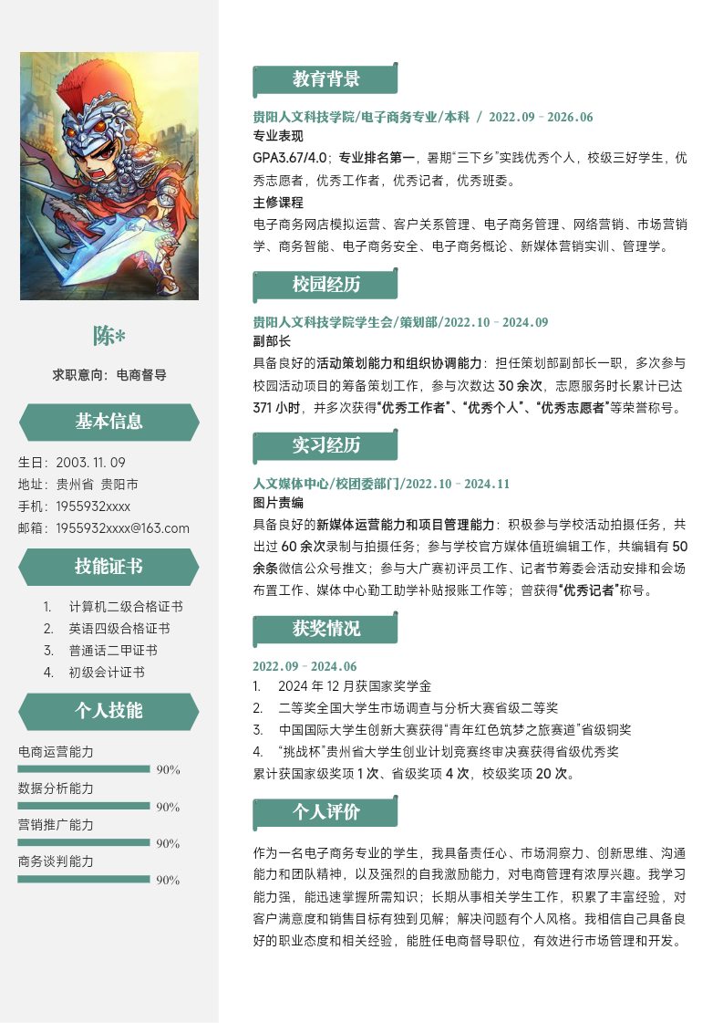 简历最重要的是数据化成果、技能与岗位需求的精准匹配。然后在把吸引HR眼球的核心技能放在最前面,并对技能做数据化成果展示,同时把获奖经历进行分类,细化相关经验,把与岗位相关的内容呈现出来。关键部分就是自我评价部分,这里不是一堆文字的堆叠陈述,而是要从专业能力、综合素质和职业定位三方面进行陈述。