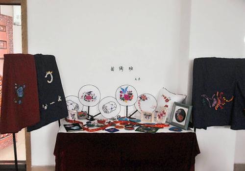 在结业典礼开始之前,领导、老师及学员们参观了此期苗绣班学员作品。