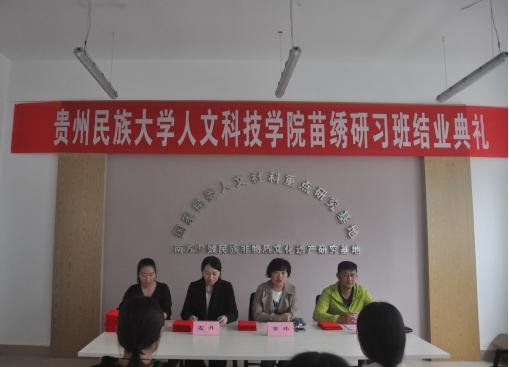 (摄影 谭明芝)2017年6月30日下午两点,由南方少数民族非物质文化遗产研究基地和我院文化产业发展研究中心联合开办的苗绣研习班(第三期)结业典礼在1A202举行。出席此次典礼的领导及老师有学院黄玮副院长;学院副院长、文化产业发展研究中心主任左丹;贵州民族大学人文科技学院科研处副处长、文化产业发展研究中心副主任余刚以及文化产业发展研究中心干事、苗绣研习班班主任及助理指导教师赵尔文达;苗绣研习班设计课指导教师袁飞。参加此次苗绣研习班结业典礼的还有第三期苗绣班的初、中、高级班的二十余位学员。