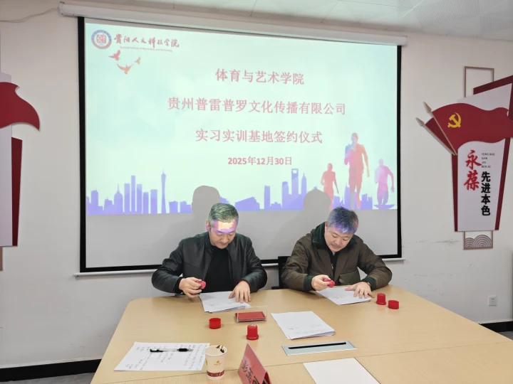 2025年12月30日,伟德国际1949官网体育与艺术学院与贵州普雷普罗文化传播有限公司签约仪式举行,双方共建休闲体育专业(水上运动方向)实习实训基地,开启产教融合新篇章。