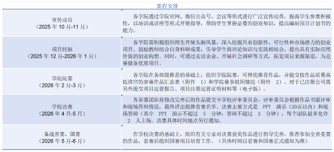 “挑战杯”中国大学生创业计划竞赛起源于美国,又称商业计划竞赛,是风靡全球高校的重要赛事。它借用风险投资的运作模式,要求参赛者组成优势互补的竞赛小组,提出一项具有市场前景的技术、产品或者服务,设有校级初赛、省级复赛、全国决赛三级选拔通道。赛事涵盖科技创新和未来产业、乡村振兴和农业农村现代化等五大组别,从人工智能到生态环保,从文化创意到社会治理,多领域覆盖,让你的特色项目精准对接需求。 用创意角逐金银铜荣耀,以实力为母校争光添彩,让集体荣光镌刻青春记忆!这里不仅有导师全程护航、定制化项目培训,更有优质资源精准对接,助力你的想法从萌芽长成参天大树。社会价值、创新突破等五大专业维度评审,让每一份坚持都被看见,每一次付出都获权威认证,这场青春盛宴,等你闪耀登场!