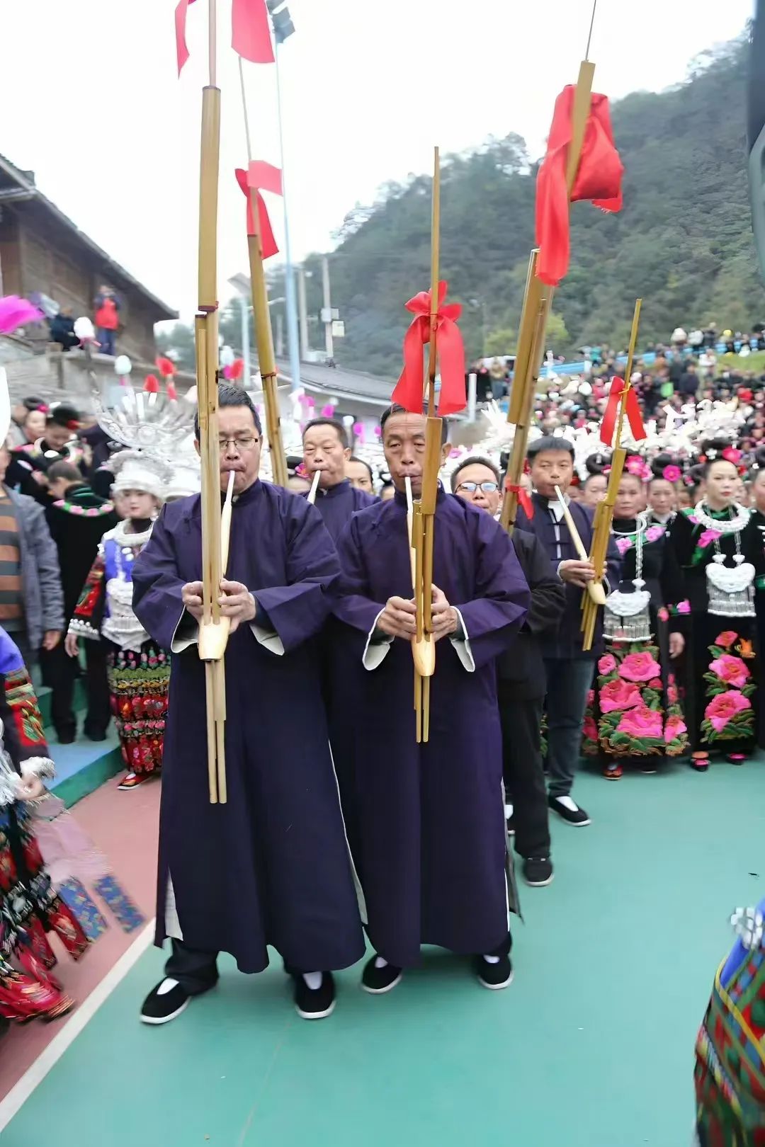 芦笙舞是苗族文化的绚丽瑰宝,也是苗年中不可或缺的精彩节目。芦笙作为苗族传统的吹奏乐器,由笙管、笙斗和簧片组成,音色明亮悠扬,仿佛能穿透时空,传递着苗族人民的情感与精神。