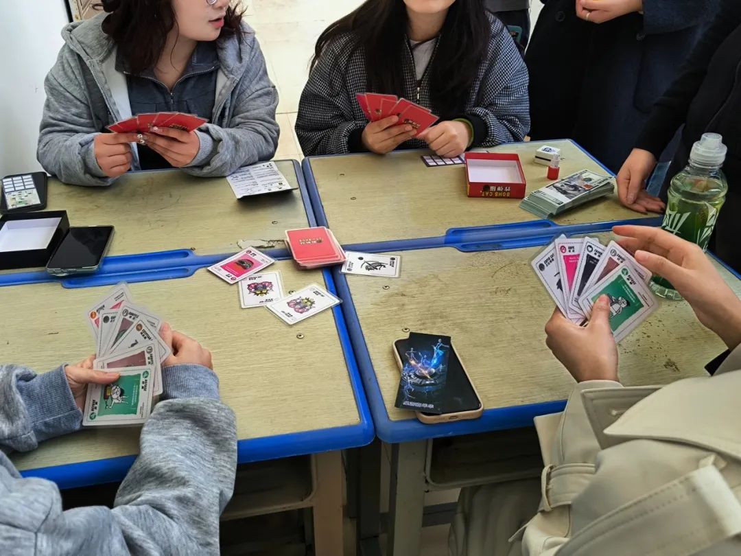狼人杀战场硝烟四起,“戏精” 玩家们疯狂飙戏,逻辑推理与演技大比拼,到底谁才是隐藏的 “狼人天菜”?海龟汤的悬疑氛围直接拉满,每一个细思极恐的真相背后,都是脑洞大开的奇妙之旅!还有 UNO 和炸弹猫咪,手速与反应力的极限对决,每一次出牌都让人肾上腺素飙升!密室逃脱卡牌更是一绝,把密室的烧脑刺激全塞进了桌面,和队友并肩作战,解锁谜题的瞬间超有成就感!最独特的是团队合作任务,领取任务卡,或在食堂击败卡牌Boss,或在教学楼解开密码谜题。在欢声笑语中,本次桌游活动圆满落下帷幕。