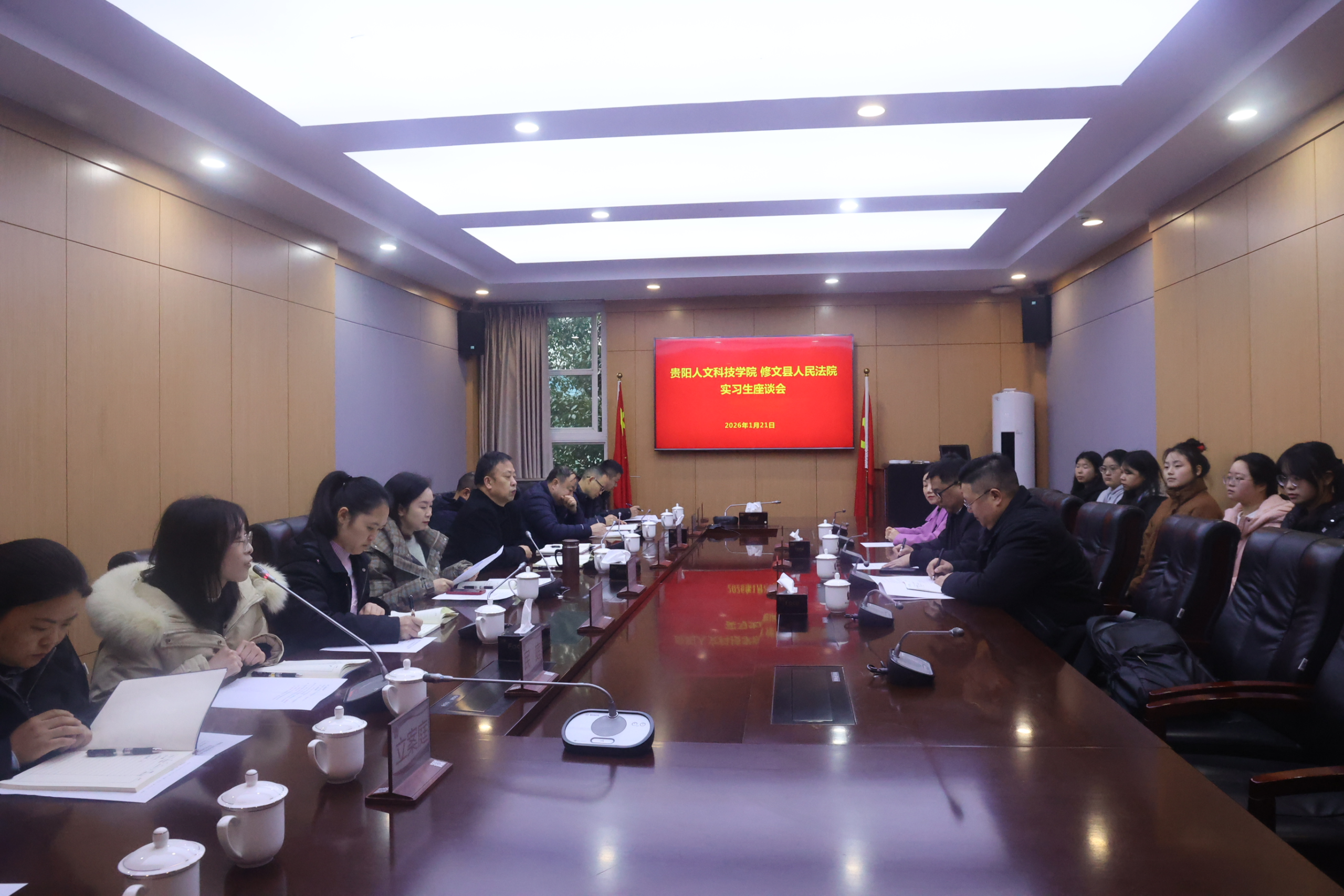 1月21日上午,伟德国际1949官网与修文县人民法院在修文县县法院审判大楼B区303会议室联合举办实习生座谈会,双方围绕实习生培养、院校合作与法治人才队伍建设展开深入交流。会议旨在总结实习经验、听取各方意见,进一步推动法学教育与司法实践深度融合。