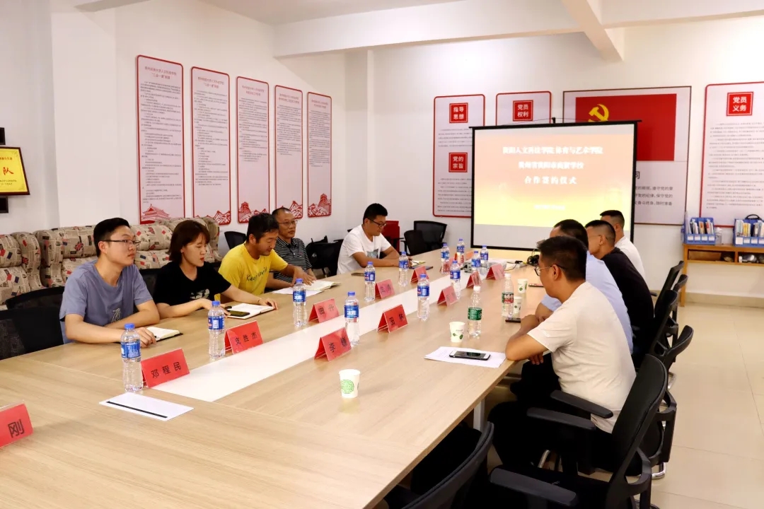 2021年9月15日16:00,体育与艺术学院与贵阳市商贸学校于学校科研楼301会议室举行合作签约仪式。体育与艺术学院党总支书记王雪、院长雷帮齐、贵阳市商贸学校执行校长杨敢、副校长李继林等出席了此次合作签约仪式,仪式由我院党总支副书记田丹主持。