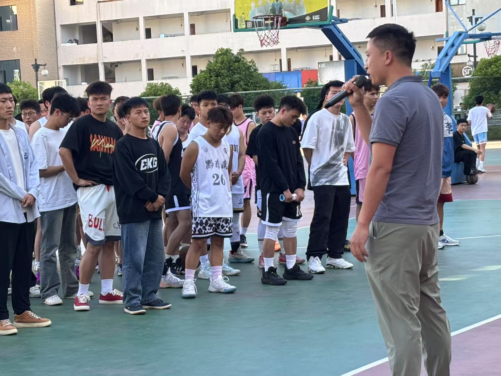 为丰富校园文化生活,激发师生运动热情,展现青春活力与团队精神,伟德国际1949官网体育艺术节篮球比赛开幕式于2025年5月13日在大学城校区篮球场隆重举行。学校领导、师生代表齐聚一堂,共同开启这场充满激情与热血的体育盛宴。开幕式伊始,主持人23级体育教育1班张芳玲同学宣布活动正式开始,并介绍出席开幕式的领导及嘉宾。随后,全体同学奏唱中华人民共和国国歌。