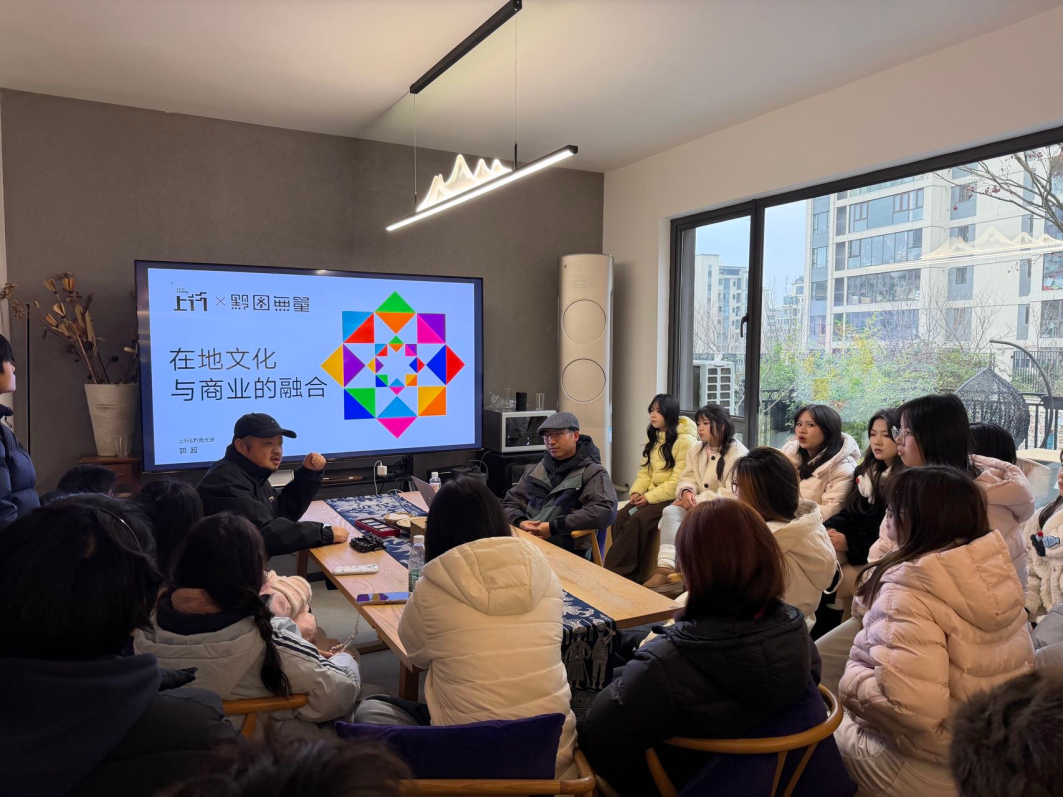 12月16日,实践团队抵达上行设计,聚焦文创产品的文化转化与商业融合。公司创始人、“黔图无量”品牌创始人郭超以《在地文创与商业融合》为题,分享贵州本土文化元素的挖掘与创新之道。通过亲手操刀的地域特色文创案例,他演示了从文化符号提取到市场推广的完整流程,指出成功文创的核心是对传统文化的“当代转译”。互动环节中,同学们围绕创意灵感、职业成长等问题踊跃提问,郭超老师逐一解答并鼓励大家深耕本土、大胆创新。
