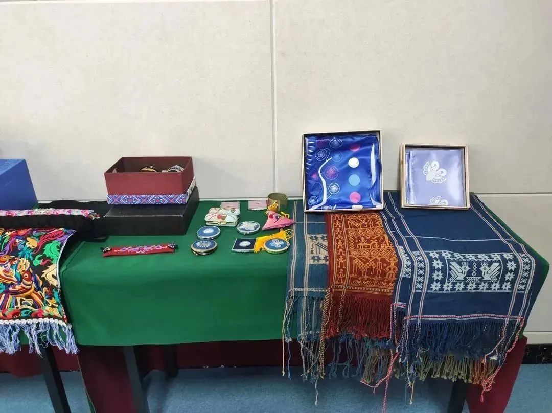 杨老师从苗族古歌开始,分析了苗族艺术史,进而从苗族刺绣的艺术和审美价值两方面作了详细的介绍,并展示了多彩的苗族刺绣蝴蝶纹、鸟纹等具体纹样图片。会场外还展示了丰富的苗族刺绣作品。